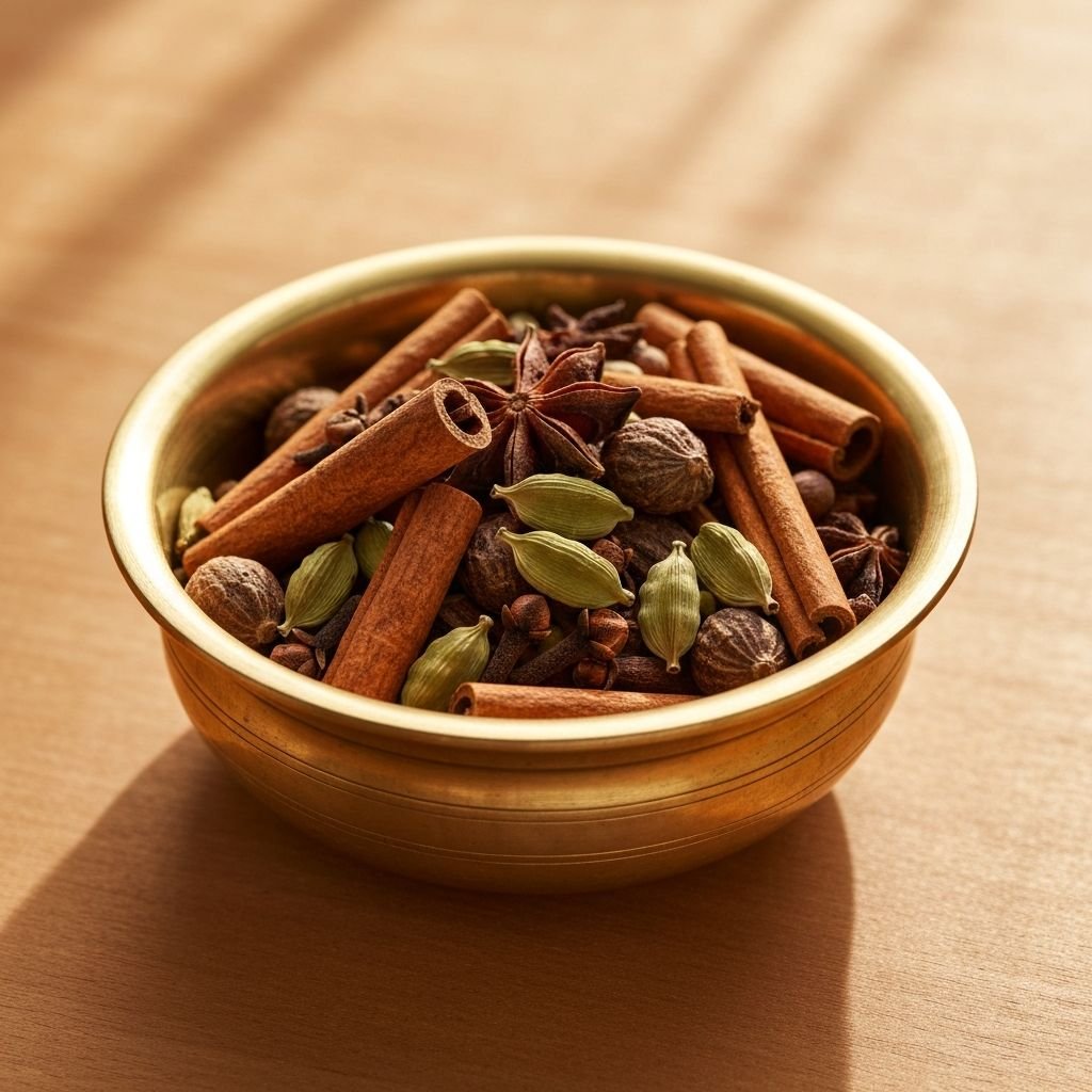 A luxurious blend of 12 whole spices including Malabar cardamom, Ceylon cinnamon, and Tellicherry pepper.
